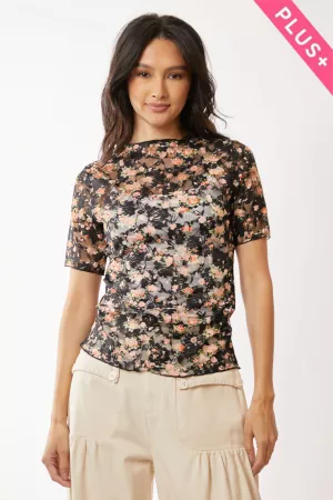 PLUS SHORT SLEEVE ROUND NECK DOT LACE MESH TOP
