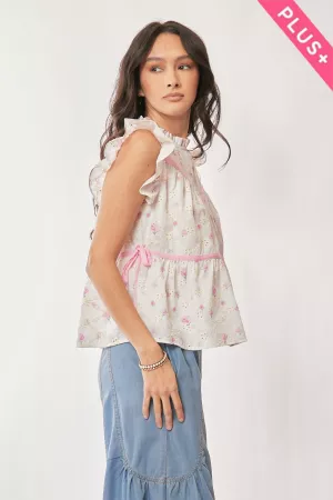 PLUS WAFFLE KNIT MULTI-FLOWER PRINT SLEEVES TOP