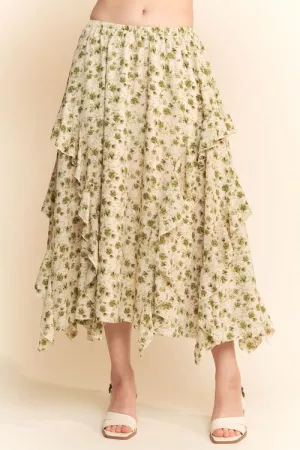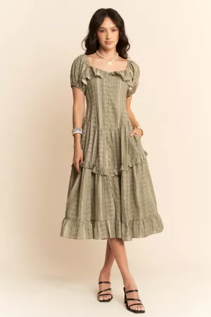 MULTI ORIENTAL LAYERED RUFFLE STRAP MIDI DRESS