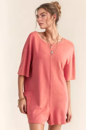 FRENCH TERRY DENIM AND STRIPE MIX MATCHED ELASTIC WAIST COLLARED V-NECK SHORT SLEEVE AMERICAN FLAG ROMPER Model is wearing Small Height: 5'8" Bust : 32B Waist : 23" Hips : 34"