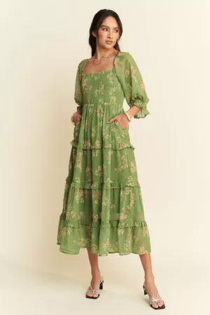 CROCHET BODICE AND PUFF SHORT SLEEVE TEXTURED TIERED SKIRT DETAIL MAXI DRESS 100%POLYESTER Model is wearing Small Height: 5'9" Bust: 32B Waist: 24" Hips: 34"