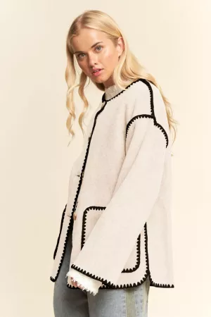 A modern layer with subtle edge, this zip front jacket features a clean silhouette accented by a distressed hem and ribbed trim. Its versatile design balances polish with character, making it an ideal addition for boutique buyers seeking elevated casualwear that feels both unique and wearable. Perfect for layering across seasons, this jacket offers effortless styling for everyday looks. Model is wearing Small Height: 5'9" Bust: 32B Waist: 24" Hips: 34"
