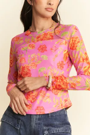 FLOWER PRINTED MESH SHORT SLEEVE TOP Model is wearing Small Height: 5'10" Bust : 34 Waist : 25” Hips : 35”
