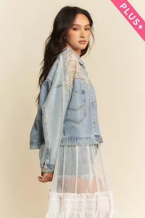 PLUS BEADED STAR DETAIL SIDE POCKET CHEST POCKET LONG SLEEVE DENIM JACKET MATCHING TOP PT12607, PWT32257A MATCHING BOTTOM PWP32257A 85%COTTON 15%POLYESTER Model is wearing 1X Height: 5'10" Bust : 42C Waist : 38" HIps 45"