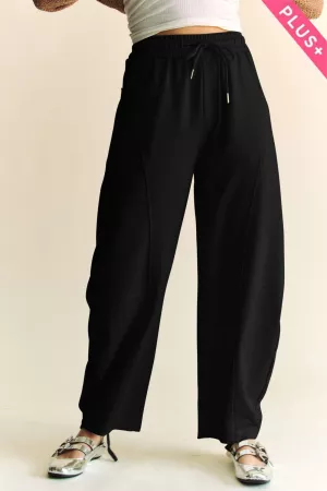 PLUS ELASTIC RUFFLED SOLID CASUAL LONG FULL PANT 95%polyester 5%spandex Model is wearing 1X Height: 5'10" Bust : 42C Waist : 38" HIps 45"
