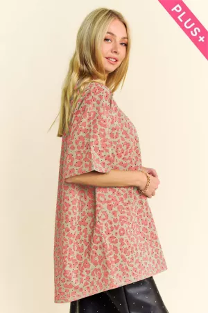 PLUS FLORAL PRINTED V NECK SHORT SLEEVE LOOSE FIT TOP SELF:100%POLYESTER Model is wearing 1X Height: 5'10" Bust : 42C Waist : 38" HIps 45"
