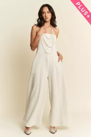 PLUS GARMENT WASHED MULTI SMOCKED DETAIL TIE STRAPS RELAXED JUMPSUIT 100%VISCOSE Model is wearing 1X Height: 5'10" Bust : 42C Waist : 38" Hips 45"