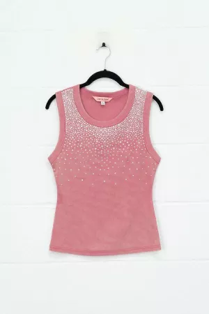 Shimmer with effortless style in this plus size rhinestone sleeveless tank. Designed with a flattering slim fit and sparkling stone details, this versatile top transitions seamlessly from casual chic to elevated layering. Perfect for boutique buyers seeking standout essentials that blend comfort, charm, and modern appeal. Model is wearing Small Height: 5'10" Bust : 34 Waist : 25” Hips : 35”