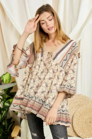 BAROQUE PRINT CHEST POCKET ROLL-UP SLEEVE BUTTON DOWN SHIRT. 70% COTTON 30% POLYESTER. Model is wearing Small Height: 5'10" Bust : 34 Waist : 25" Hips : 35"