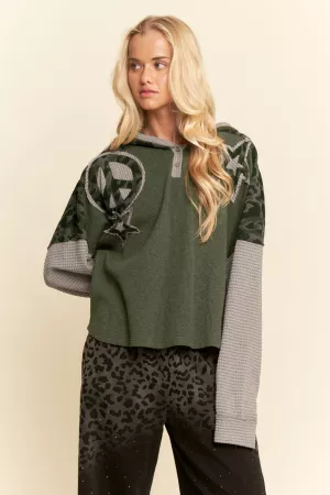 A relaxed textured knit top featuring a soft collared neckline, partial button front, and front patch pockets for laid-back charm. The boxy cropped silhouette offers effortless drape and versatile styling for both casual and boutique looks. Perfect for pairing with wide-leg trousers or skirts for a cozy yet polished everyday statement. Model is wearing Small Height: 5'8" Bust : 3